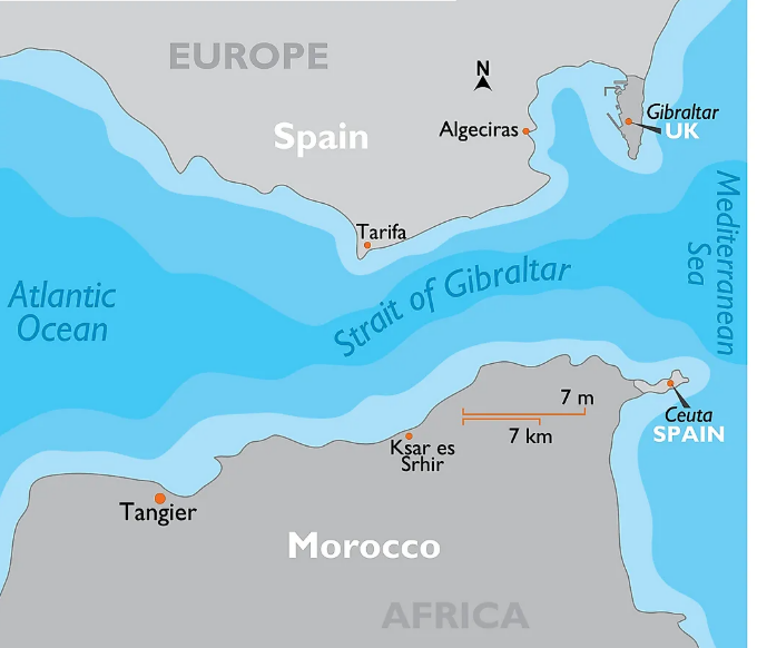 - Connects: Atlantic Ocean → Mediterranean Sea