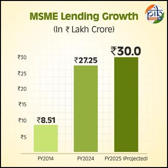 - MSME lending rose from ₹8.51 lakh crore (FY14) to ₹27.25 lakh crore (FY24); projected to cross ₹30 lakh crore (FY25).