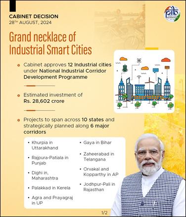 - 12 new industrial areas approved (₹28,602 crore) across 10 states.