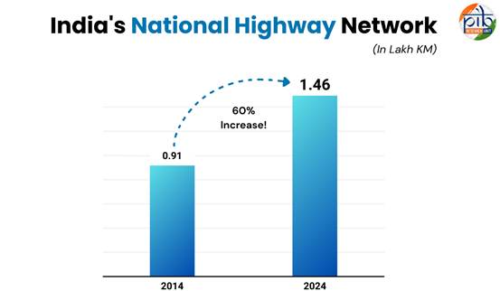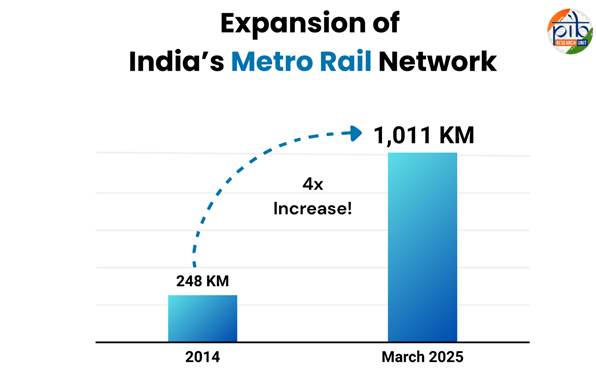 - Metro Rail Expansion: 248 km (2014) → 1,011 km (2025); Regional Rapid Transit System (RRTS) integrated.