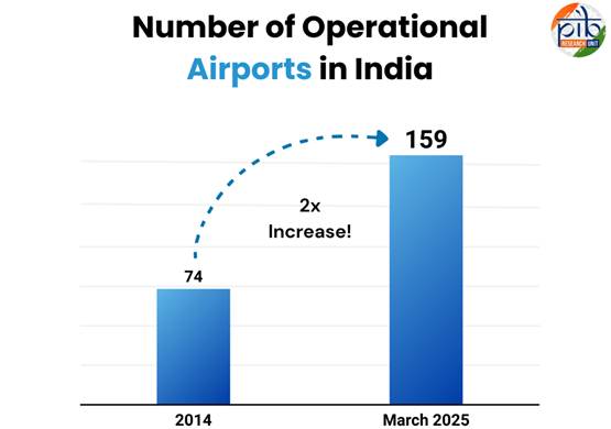 - Operational airports increased from 74 (2014) → 159 (2025).