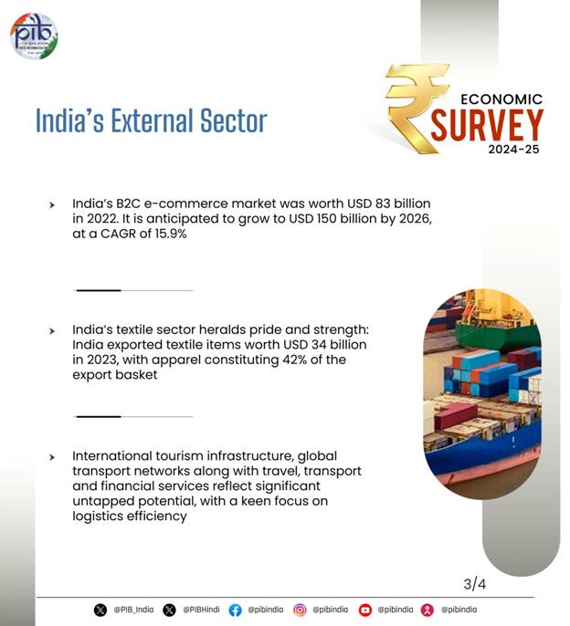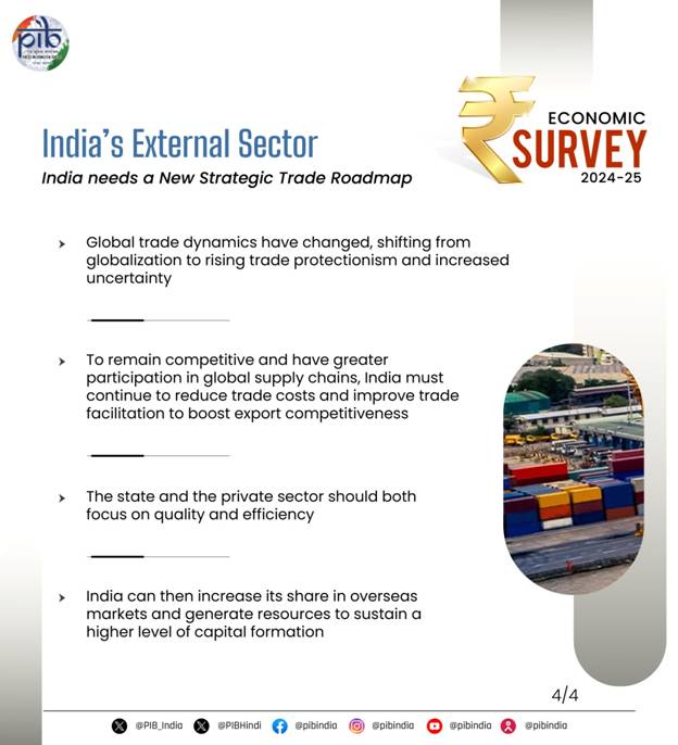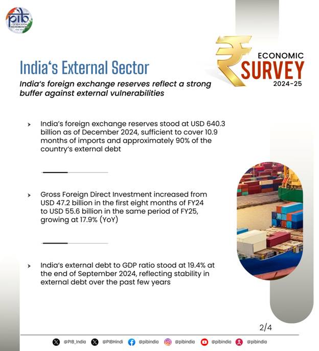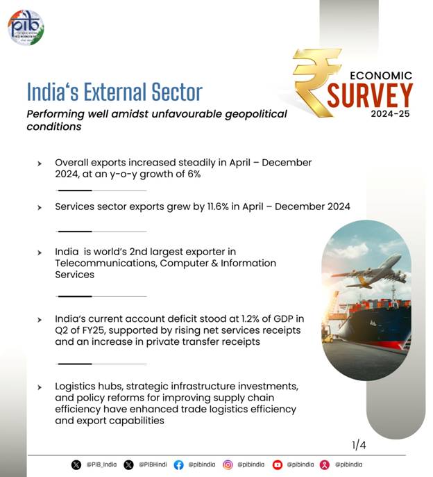 The Economic Survey 2024–25 highlights India’s strong external sector performance despite global headwinds such as geopolitical tensions, protectionist trade policies, and disruptions in major shipping routes. The Survey projects optimism, noting India’s growing global trade footprint, stable external debt position, and sustained investor confidence.