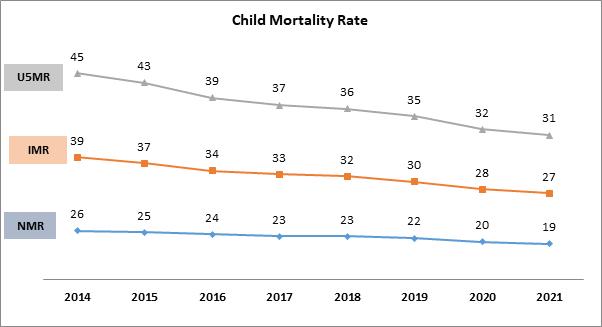 Fell from 39 (2014) to 27 (2021) per 1,000 live births. - Neonatal Mortality Rate (NMR):