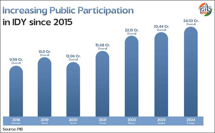 - Global participation has grown significantly—from 9.59 crore participants in 2018 to 24.53 crore in 2024.