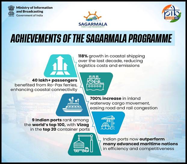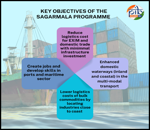 - Aim: Transform India’s maritime sector via port modernization, connectivity, coastal economic development, and logistics efficiency.