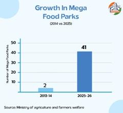 - Mega Food Parks: Expanded from 2 (2014) to 41 (2025), with 24 operational and 17 under implementation, enhancing farm-to-market linkages.