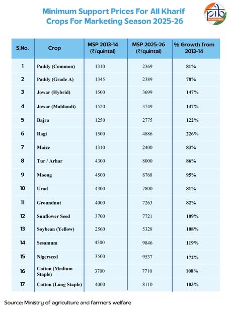 - Since 2018–19, MSP for all mandated crops ensures a minimum 50% return over the all-India weighted average cost of production.