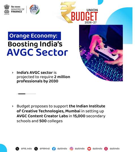 In the education and creative sector, the establishment of AVGC (Animation, Visual Effects, Gaming, and Comics) Content Creator Labs in 15,000 schools and 500 colleges represents a significant push towards the Orange Economy, which focuses on creative industries. With the AVGC sector projected to require 2 million professionals by 2030, this initiative addresses the skill gap and future workforce demand in digital content and media industries.