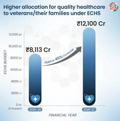 The Budget also prioritises veterans’ welfare, with ₹12,100 crore allocated to the Ex-Servicemen Contributory Health Scheme (ECHS) and over ₹1.71 lakh crore for defence pensions, ensuring healthcare and financial security for ex-servicemen and their families.