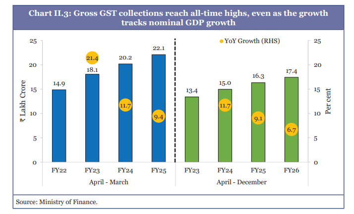 The Goods and Services Tax (GST) has emerged as a stabilising fiscal instrument, strengthening government revenues, deepening formalisation, and reinforcing the reform-oriented policy framework. During April–December 2025, gross GST collections reached ₹17.4 lakh crore, recording a 6.7% YoY growth, broadly aligned with nominal GDP growth conditions and moderated by lower inflation. Despite lower percentage growth, absolute collections have achieved multiple all-time highs, indicating sustained robustness.