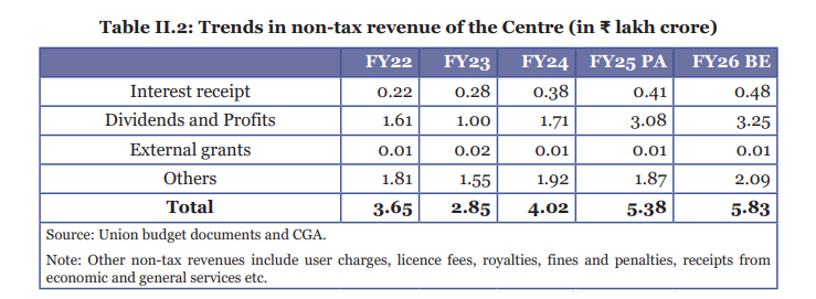 The non-tax revenues of the Central Government have shown stability at around 1.4% of GDP in the post-pandemic period, broadly in line with pre-pandemic levels, thereby providing consistent support to overall revenue receipts. This stability is primarily driven by a sharp rise in dividends and profits, along with improved performance of public sector institutions.