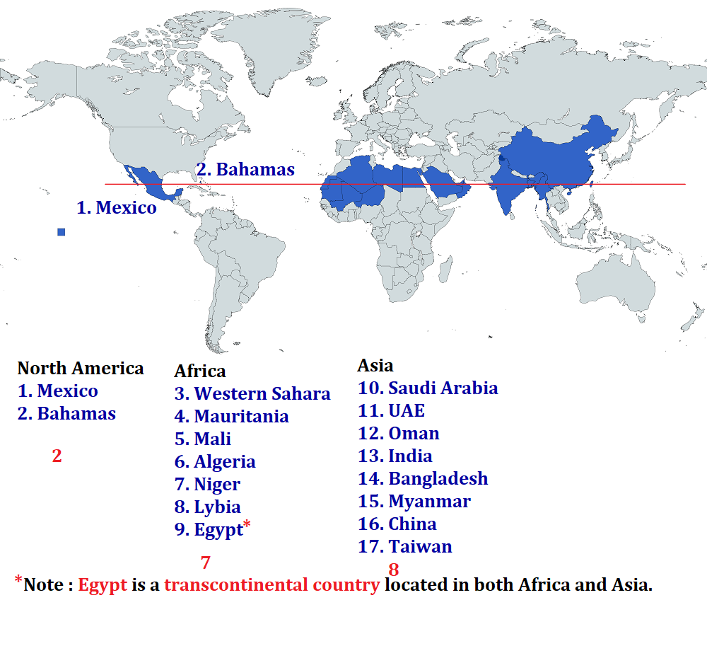 B. The Tropic of cancer passes through 17 countries, 3 continents and 6 water bodies.
