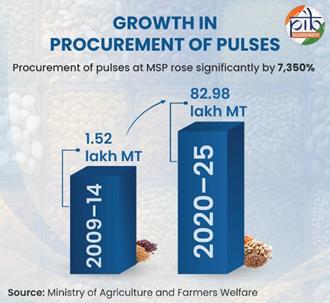 The policy is now increasingly aligned with nutritional and strategic goals. Higher MSPs and assured procurement for pulses, oilseeds, and nutri-cereals (Shree Anna) aim to correct historical biases toward rice-wheat systems. Notably, the government has committed to 100% procurement of pulses (tur, urad, masoor) till 2028–29, marking a decisive push towards import substitution and self-reliance.