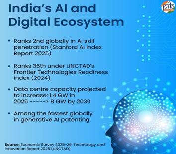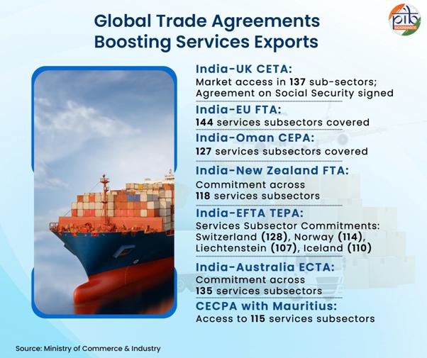 India’s services exports have demonstrated robust growth and resilience, acting as a buffer against global economic uncertainties and trade disruptions. The sector recorded exports worth USD 348.4 billion during April–January FY2025-26, highlighting its growing importance in India’s external sector. Notably, the share of services exports in GDP reached 10% in H1 FY26, indicating a structural shift towards a services-led growth model.The growth is primarily driven by software services, business services, and consulting segments, with software alone accounting for over 40% of total services exports. Additionally, professional and management consulting services have witnessed rapid expansion, increasing their share significantly in recent years. This reflects India’s increasing specialization in knowledge-intensive and digitally delivered services.A key factor supporting this growth is the expansion of Global Capability Centres (GCCs), with over 1,700 GCCs employing around 1.9 million professionals, making India the global hub for such operations. These centres are evolving from back-office functions to high-value activities such as AI, cybersecurity, analytics, and product development, thereby enhancing export competitiveness.Further, India’s digital and AI ecosystem is strengthening its global position. India ranks second globally in AI skill penetration, and its improving ranking in UNCTAD’s Frontier Technologies Readiness Index reflects enhanced technological capabilities. The rapid growth in data centres, cloud infrastructure, and AI startups is expected to further boost exports of digitally delivered services.Policy measures in the Union Budget 2026–27 have reinforced this trajectory. Key initiatives include: